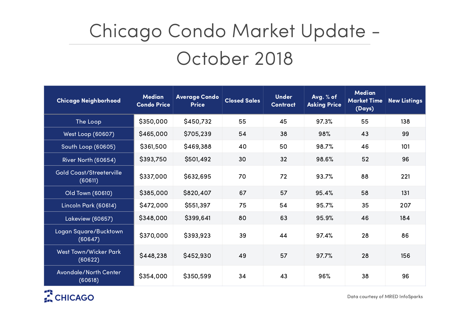 Fortunately, the decline in sales was short lived. Based on the latest data, closed sales were up in October in over half the neighborhoods we surveyed, including West Loop, Old Town, Lincoln Park, Lakeview, Logan Square, Bucktown, West Town, Wicker Park, Avondale and North Center.